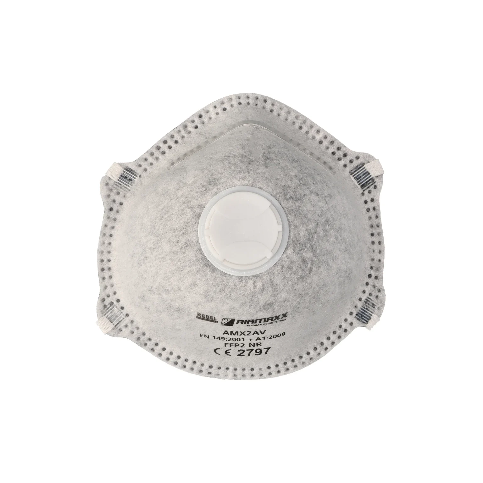 The Airmaxx FFP2V Mask with Active Carbon and Valve disposable dust mask has an aluminium strip glue bonded nose clip, 5 layers consisting of non-woven polyester and a rubber one way exhalation valve. The Airmaxx has a low profile and adjustable nose clip to ensure a better fit. The latex free head straps are pre-stretched and are glue bonded to the mask. The Airmaxx will protect against welding fumes, nuisance odours and dust.